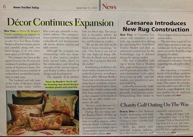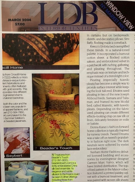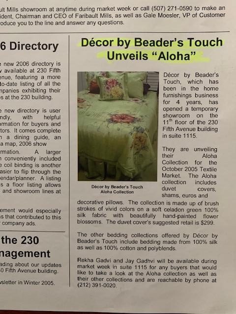 Achievements and Press Newspaper Articles Dec Pillows Article Article in Manuscript Magazine Dog Bed Article Dog Bed Dog Bed Peony Vine Bedding Decor Expansion Aloha Bedding Lucky Bamboo Bedding Bali Bedding Decoratif Bedding Tropical Romance Rekha at Javits Center - first show