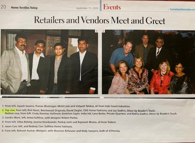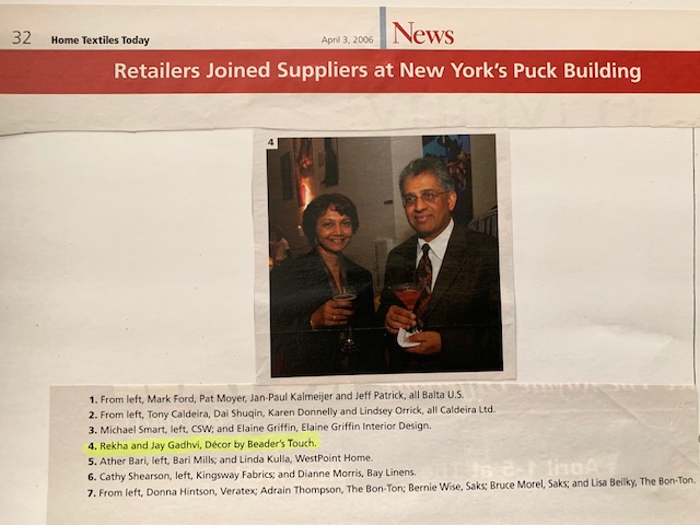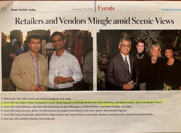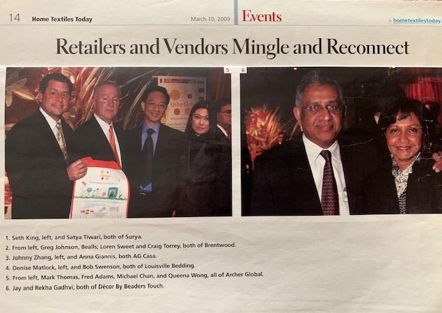 Achievements and Press Party Rekha with Jennifer - Home Textiles Today, Editor in Chief Home Textiles Today 2005 Jay & Rekha - Home Textiles Today LDB Magazine Party Home Textiles Today Party Home Textiles Today Party Home Textiles Today New York Market Week - Henna Home Textiles Today Party Team Home Textiles Today Great Indoor Team Home Textiles Today Kick Off Party Home Textiles Today with Scott Fishman and Leena Gaurang Home Textiles Today Jay and Rekha 2009